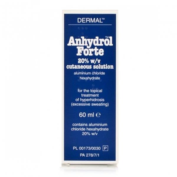 Anhydrol Forte 20% Cutaneous Solution Roll On is a clear, colourless liquid that contains no fragrance. The active ingredient, Aluminium chloride works by blocking the sweat glands. This causes the pressure of fluid within the sweat glands to rise to the point where it shuts off sweat production.