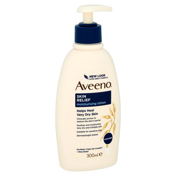 Aveeno Skin Relief Moisturising Lotion with a rich, fast absorbing and non-greasy formula. Clinically proven to moisturise and effectively sooth very dry, irritable or sensitive skin. Even suitable for diabetic's rough, dry skin. Formulated with pre-biotic* Triple Oat Complex (Oat Flour, Oat Extract, Oat Oil), it helps to improve the balance of the skin's natural microbiome, leaving skin more resilient and healthy-looking from day one.