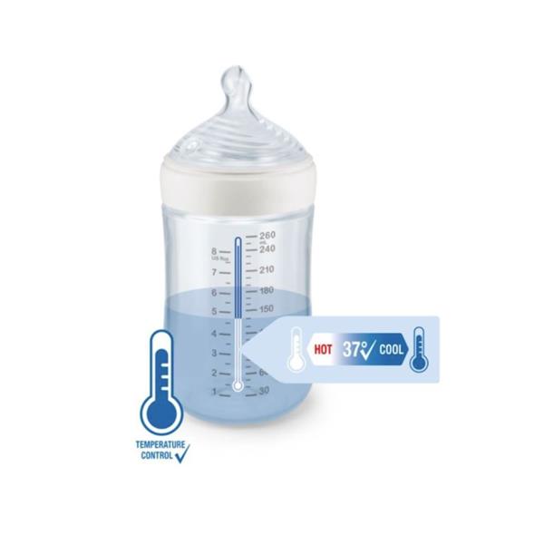 Nuk Nature Sense Medium Flow Bottle 260Ml with built-in temperature control indicator changes colour when the feed is too hot.