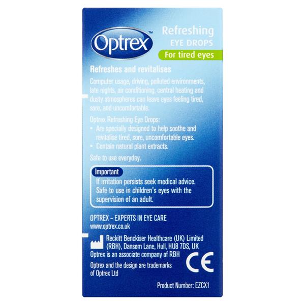 Optrex Refreshing Eye Drops For Tired Eyes 10Ml Computer usage, driving, polluted environments, late nights, air conditioning, central heating and dusty atmospheres can leave eyes feeling tired, sore, and uncomfortable. Optrex Refreshing Eye Drops are specially formulated to help combat the effects of modern living.