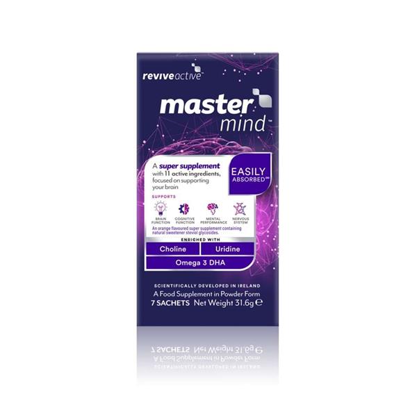 Revive Active Mastermind 7 Sachets was developed in conjunction with the Brain Performance Nutrition Research Centre at Northumbria University, Mastermind is a powerful blend of 11 nutrients that support brain function, cognitive function, and mental performance. Zinc contributes to normal cognitive function. DHA contributes to the maintenance of normal brain function. Pantothenic Acid contributes to normal mental performance. Vitamin B6 contributes to the normal function of the nervous system. Vitamin C contributes to normal psychological function.