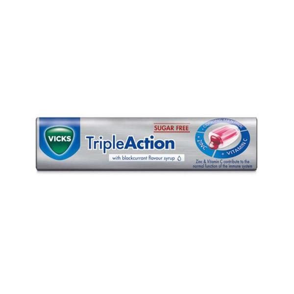 Vicks Triple Action Throat Lozenge filled with blackcurrant juice concentrate, menthol and natural mint flavouring. With sweeteners.